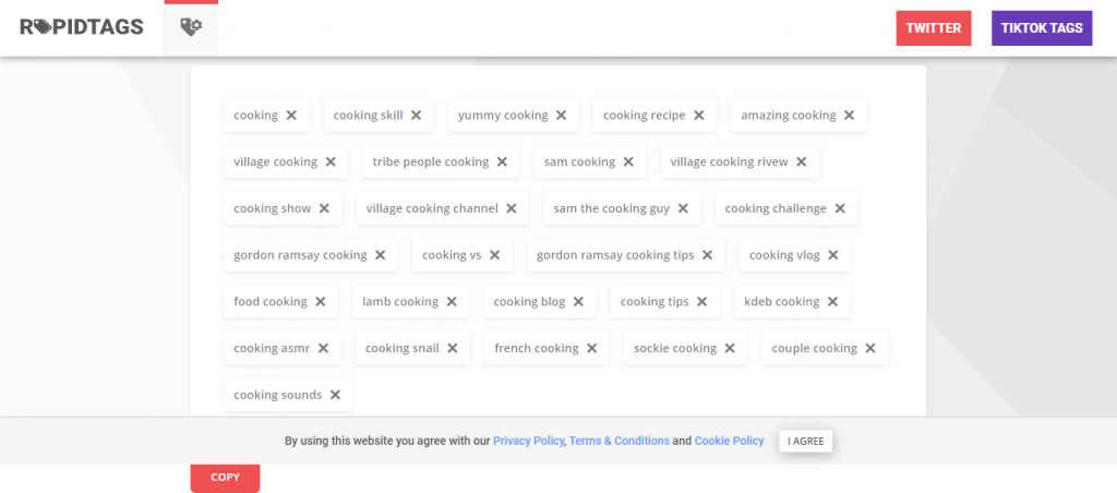 Rapid tags is a website that can easily generate tags. This does not require any account creation. All you have to do is do a google search for rapid tags. The link will be rapidtags.io. When you enter it, a tab like this will open. In the search bar, type the name of the video we are making or the keyword. For instance, if you are planning to make a video on cooking chicken curry, ‘cook chicken’. They will suggest the tags we want. If you click on ‘copy’ in it, you can copy them and use them in your youtube tags.