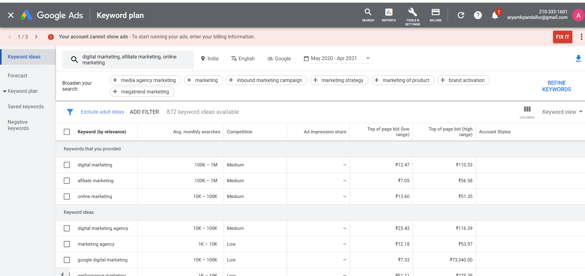 We can see many keyword research tools, Google Keyword Planner is one of the free and user-friendly tools included in the Google Ads suite. The Google keyword planner is used to find the right keywords for your Google Ads campaigns. Google ad words were created primarily for keyword research and advertising campaigns. You can view keywords by selecting the Keyword tab. The results returned for each of the options can also be refined by altering the filters that restrict the location, language, and date range. Hopefully, this guide will help you find things faster and explore advanced features!